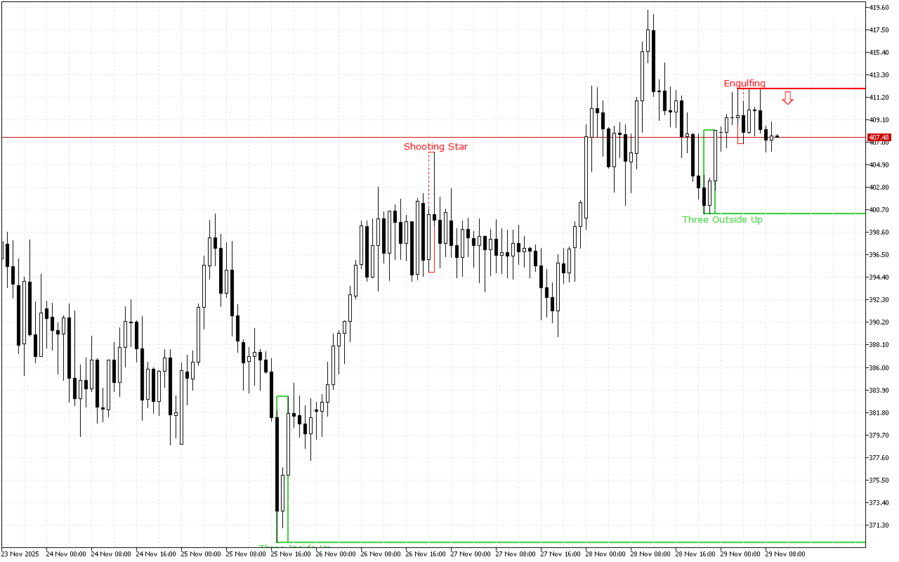 This level was formed by the Three Outside Bars Up pattern. The pattern consists of three Japanese candlesticks: the first candlestick has a short black real body, the second candlestick has a long white real body and completely engulfs the first candlestick, and the third candlestick is also white, closing above the second candlestick.