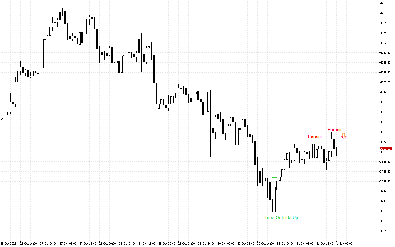 Ce niveau a été formé par le modèle Bearish Harami, qui est constitué de deux chandeliers japonais où le deuxième chandelier avec un corps plus petit se trouve à l’intérieur du corps du premier chandelier.