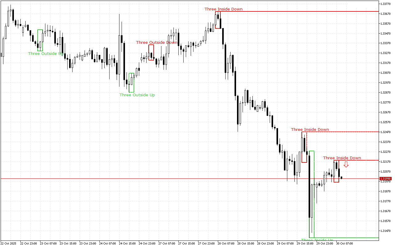 Ce niveau a été formé par le schéma Trois à l’intérieur en haut. Il s’agit de trois bougies japonaises : la 1ère bougie a un corps réel blanc court, la 2ème bougie a un corps réel blanc et se trouve complètement à l’intérieur du corps de la 1ère bougie, et la 3ème bougie est également blanche et se termine au-dessus du corps de la 2ème bougie.