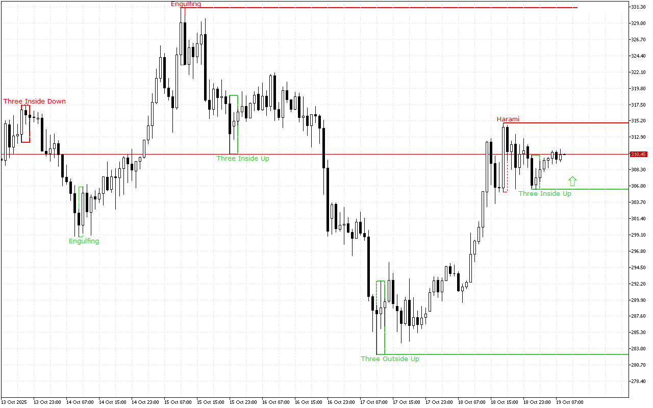Ce niveau a été formé par le schéma Trois à l’intérieur en haut. Il s’agit de trois bougies japonaises : la 1ère bougie a un corps réel blanc court, la 2ème bougie a un corps réel blanc et se trouve complètement à l’intérieur du corps de la 1ère bougie, et la 3ème bougie est également blanche et se termine au-dessus du corps de la 2ème bougie.