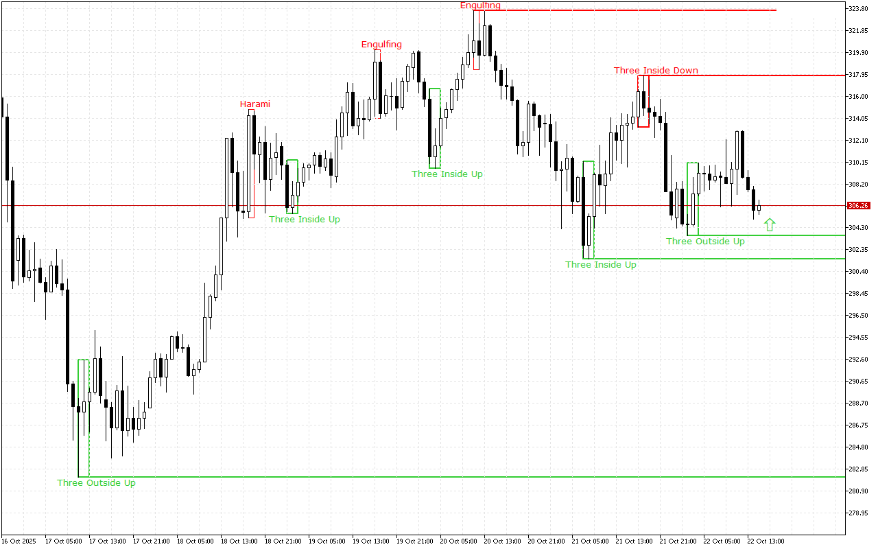 Ce niveau a été formé par le schéma des trois barres extérieures vers le haut. Il s’agit de trois chandeliers japonais : la 1ère bougie a un corps réel court et noir, la 2ème bougie a un corps réel long et blanc et englobe complètement la 1ère bougie, et la 3ème bougie est également blanche, clôturant au-dessus de la 2ème bougie.