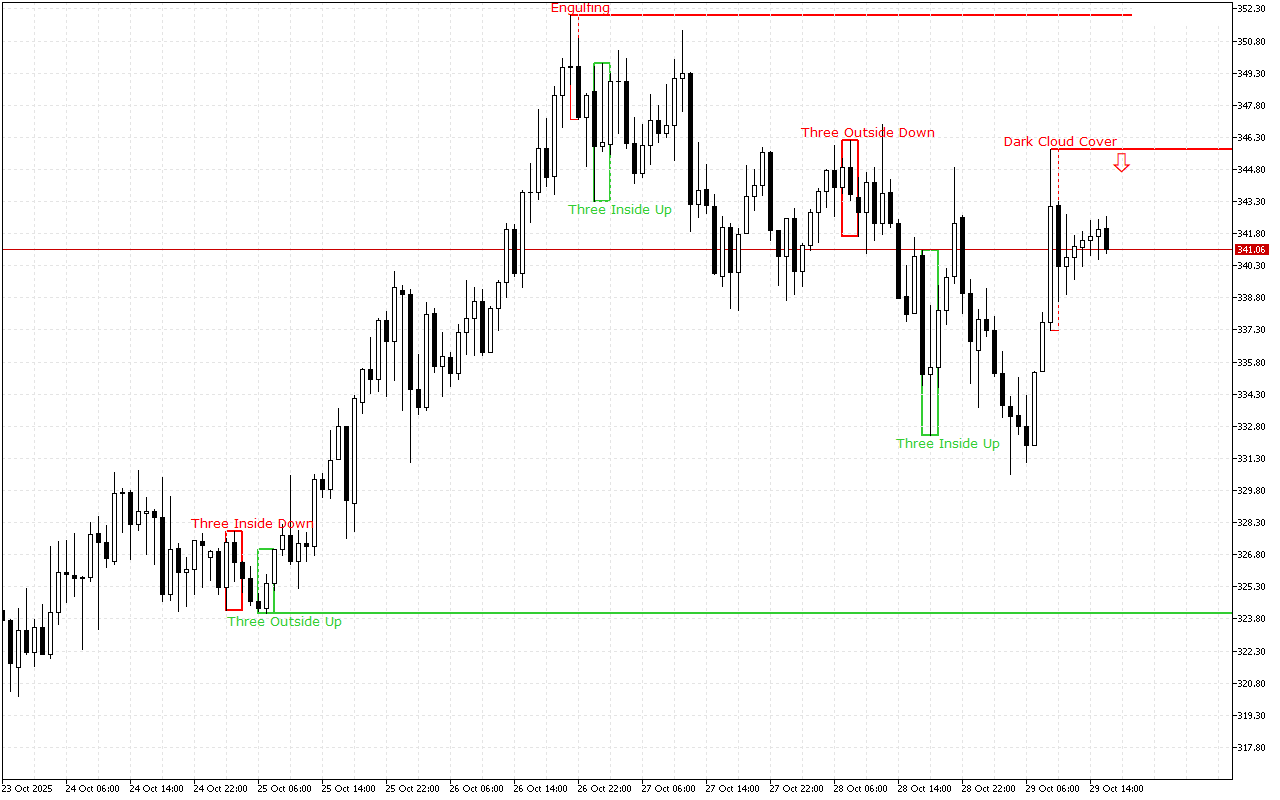 Ce niveau a été formé par le schéma des trois barres extérieures vers le haut. Il s’agit de trois chandeliers japonais : la 1ère bougie a un corps réel court et noir, la 2ème bougie a un corps réel long et blanc et englobe complètement la 1ère bougie, et la 3ème bougie est également blanche, clôturant au-dessus de la 2ème bougie.