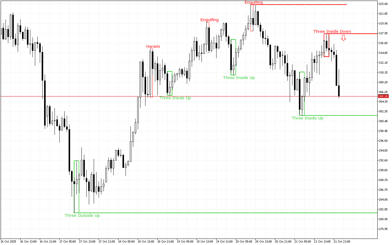 Ce niveau a été formé par le schéma Trois à l’intérieur en haut. Il s’agit de trois bougies japonaises : la 1ère bougie a un corps réel blanc court, la 2ème bougie a un corps réel blanc et se trouve complètement à l’intérieur du corps de la 1ère bougie, et la 3ème bougie est également blanche et se termine au-dessus du corps de la 2ème bougie.