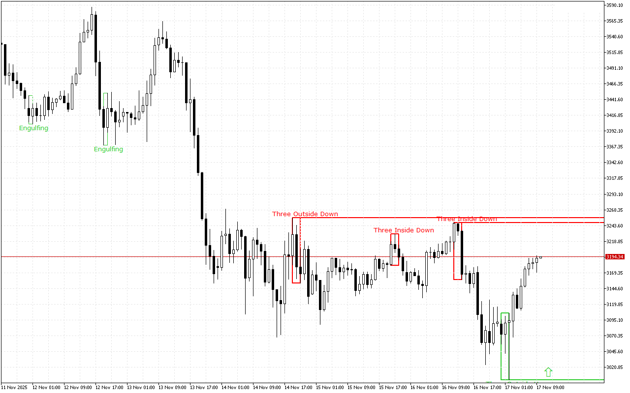 Ce niveau a été formé par le schéma des trois barres extérieures vers le haut. Il s’agit de trois chandeliers japonais : la 1ère bougie a un corps réel court et noir, la 2ème bougie a un corps réel long et blanc et englobe complètement la 1ère bougie, et la 3ème bougie est également blanche, clôturant au-dessus de la 2ème bougie.