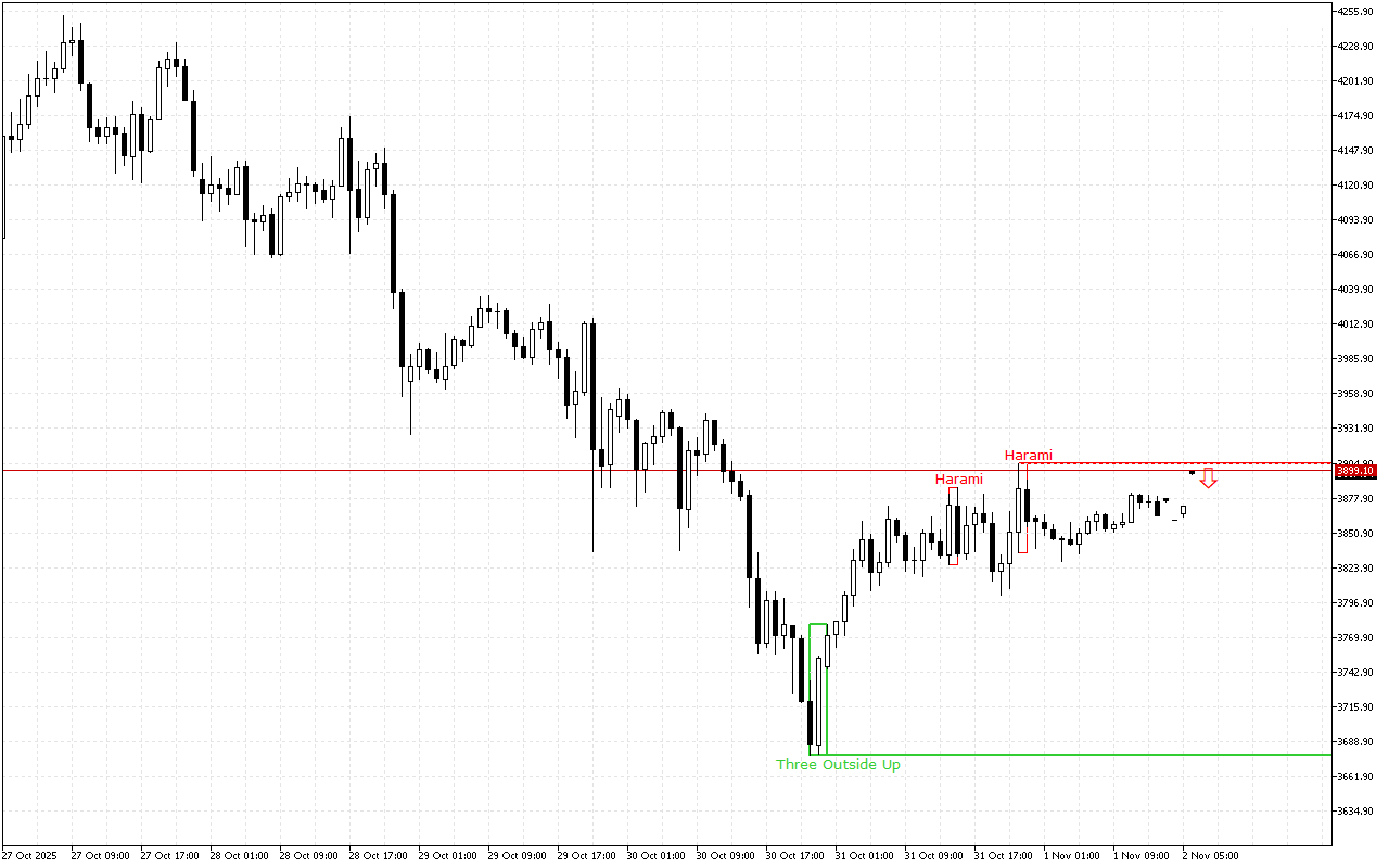 Ce niveau a été formé par le modèle Bearish Harami, qui est constitué de deux chandeliers japonais où le deuxième chandelier avec un corps plus petit se trouve à l’intérieur du corps du premier chandelier.