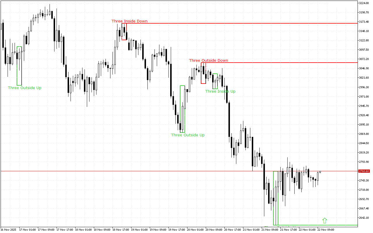 Ce schéma est formé par trois barres extérieures à la baisse. Il s’agit d’une combinaison de trois chandeliers japonais. La 1ère bougie a un corps réel blanc court, la 2ème bougie a un corps réel noir long et engloutit complètement la 1ère bougie, et la 3ème bougie est également noire, clôturant en dessous de la 2ème bougie.