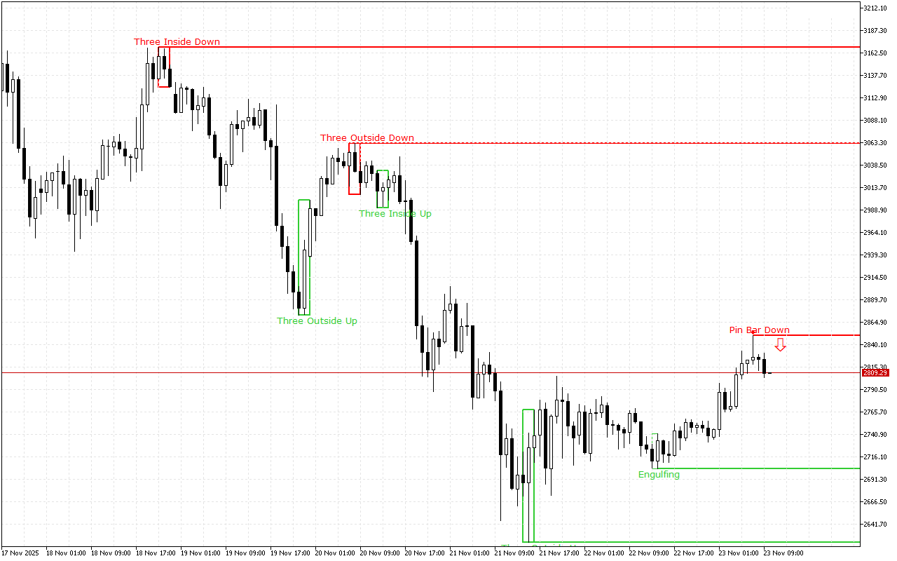 Ce niveau a été formé par un modèle Pin Bar. Ce modèle est représenté par une seule bougie japonaise avec un petit corps réel et une longue ombre supérieure. Il s’agit de l’un des modèles clés du système Price Action.