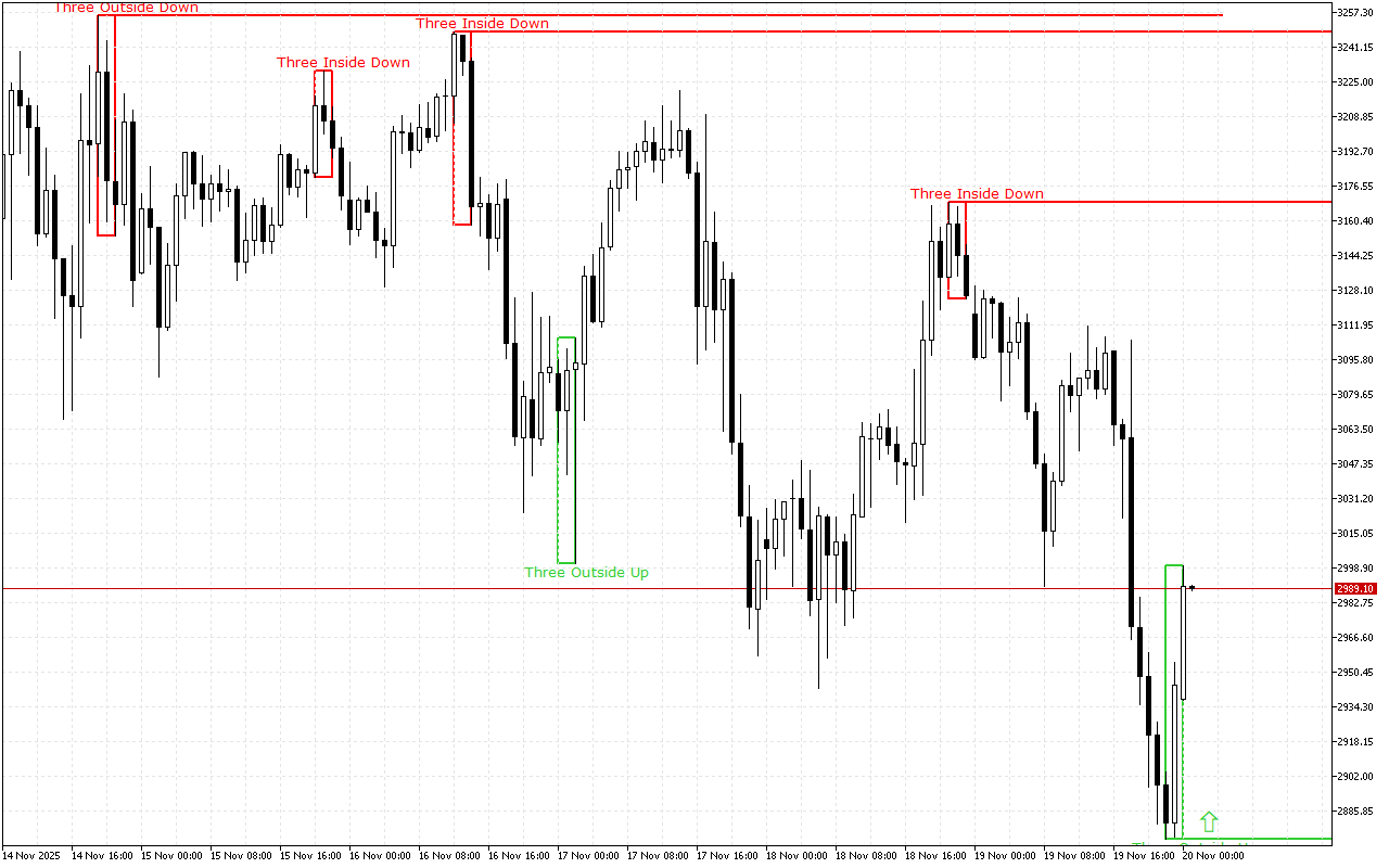Ce niveau a été formé par le schéma des trois barres extérieures vers le haut. Il s’agit de trois chandeliers japonais : la 1ère bougie a un corps réel court et noir, la 2ème bougie a un corps réel long et blanc et englobe complètement la 1ère bougie, et la 3ème bougie est également blanche, clôturant au-dessus de la 2ème bougie.