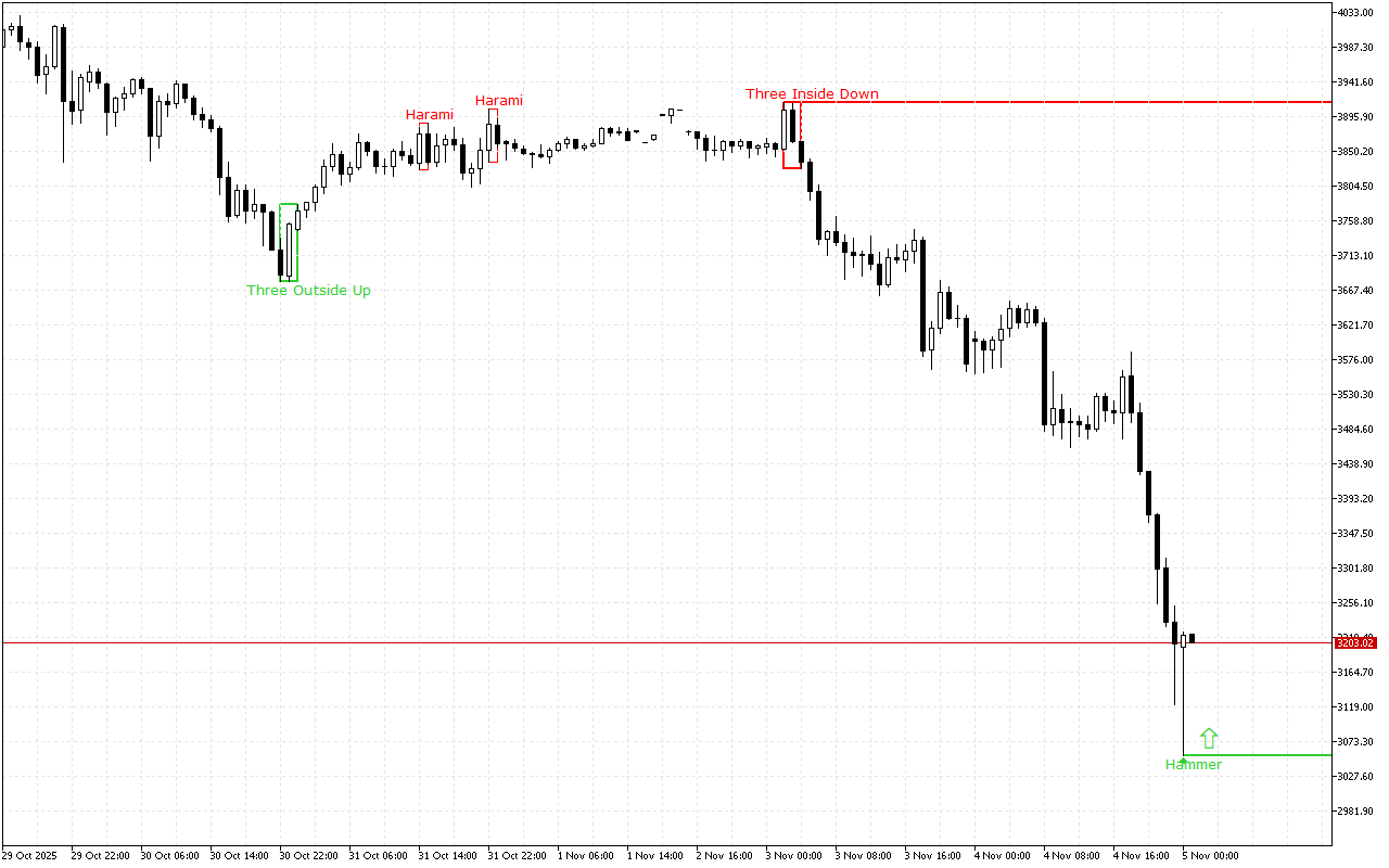 Ce niveau a été formé par le schéma Trois à l’intérieur du bas. Il s’agit de trois bougies japonaises : la 1ère bougie a un corps réel noir et court, la 2ème bougie a également un corps réel noir et est complètement à l’intérieur du corps de la 1ère bougie, et la 3ème bougie est également noire et clôture en dessous du corps de la 2ème bougie.