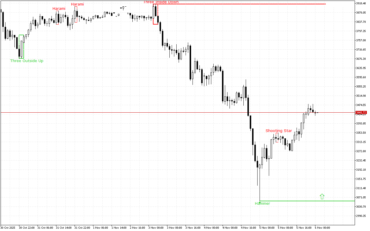 Ce niveau a été formé par le schéma Trois à l’intérieur du bas. Il s’agit de trois bougies japonaises : la 1ère bougie a un corps réel noir et court, la 2ème bougie a également un corps réel noir et est complètement à l’intérieur du corps de la 1ère bougie, et la 3ème bougie est également noire et clôture en dessous du corps de la 2ème bougie.
