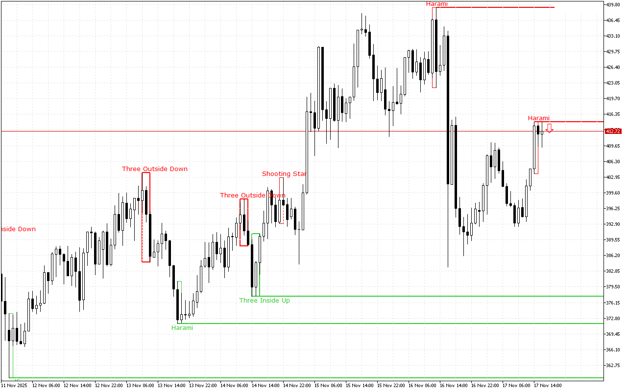 Ce niveau a été formé par le modèle Bearish Harami, qui est constitué de deux chandeliers japonais où le deuxième chandelier avec un corps plus petit se trouve à l’intérieur du corps du premier chandelier.
