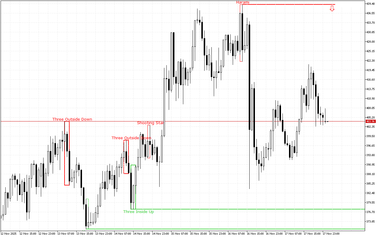 Ce niveau a été formé par le modèle Bearish Harami, qui est constitué de deux chandeliers japonais où le deuxième chandelier avec un corps plus petit se trouve à l’intérieur du corps du premier chandelier.