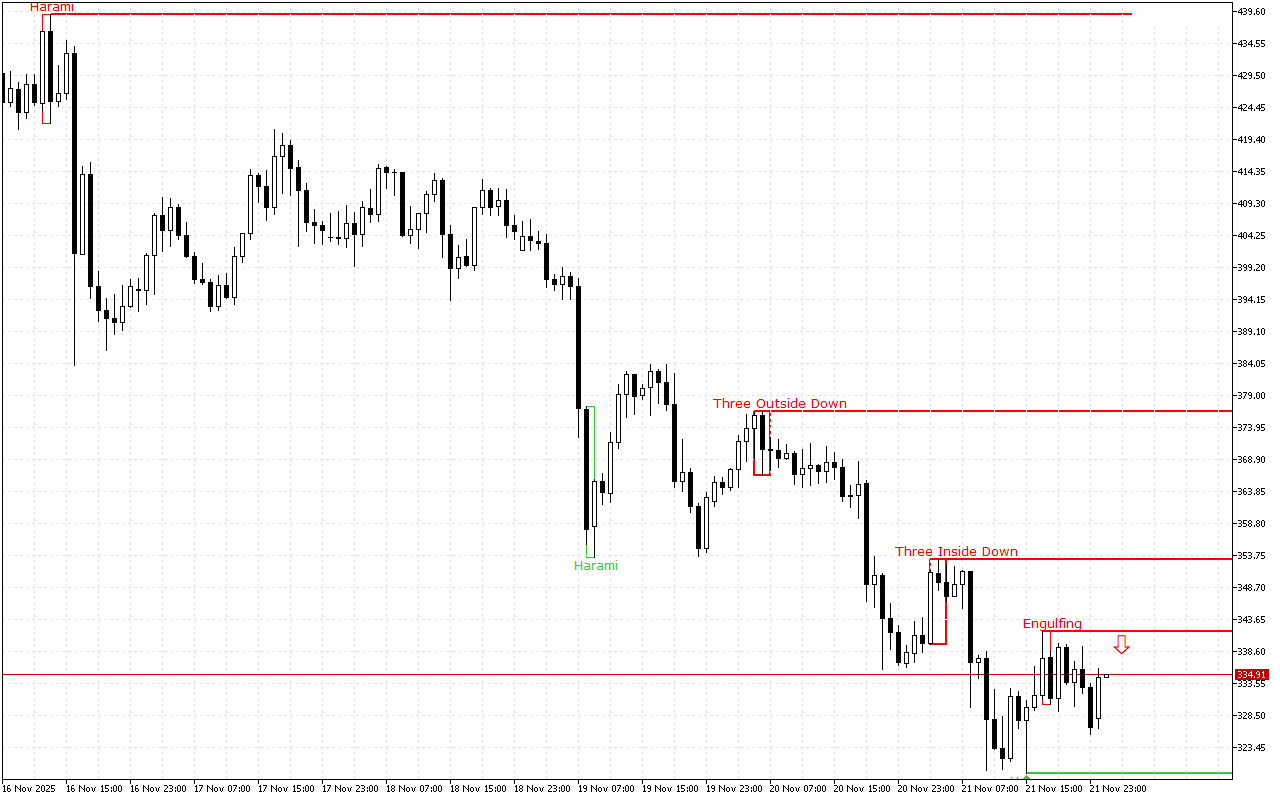 Le modèle d’engloutissement baissier a formé ce niveau. Il est constitué de deux bougies japonaises : la première bougie est située à l’intérieur du corps de la deuxième bougie.