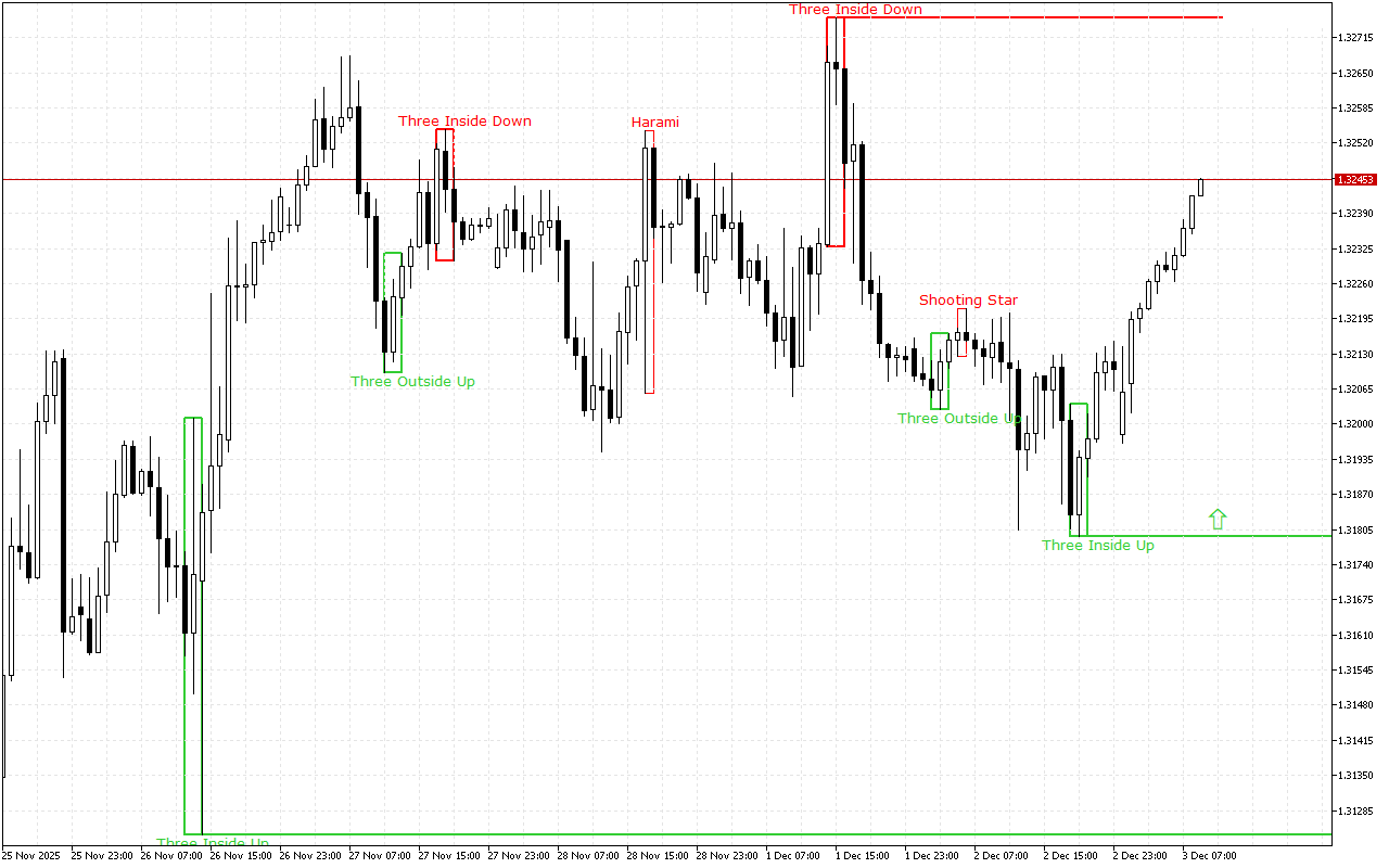 Ce niveau a été formé par le schéma Trois à l’intérieur en haut. Il s’agit de trois bougies japonaises : la 1ère bougie a un corps réel blanc court, la 2ème bougie a un corps réel blanc et se trouve complètement à l’intérieur du corps de la 1ère bougie, et la 3ème bougie est également blanche et se termine au-dessus du corps de la 2ème bougie.