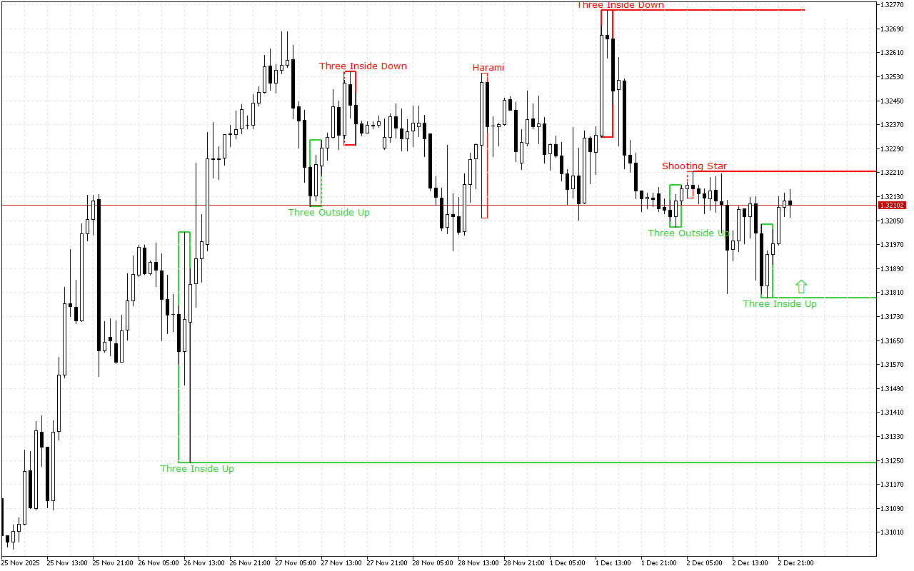Ce niveau a été formé par le schéma Trois à l’intérieur en haut. Il s’agit de trois bougies japonaises : la 1ère bougie a un corps réel blanc court, la 2ème bougie a un corps réel blanc et se trouve complètement à l’intérieur du corps de la 1ère bougie, et la 3ème bougie est également blanche et se termine au-dessus du corps de la 2ème bougie.