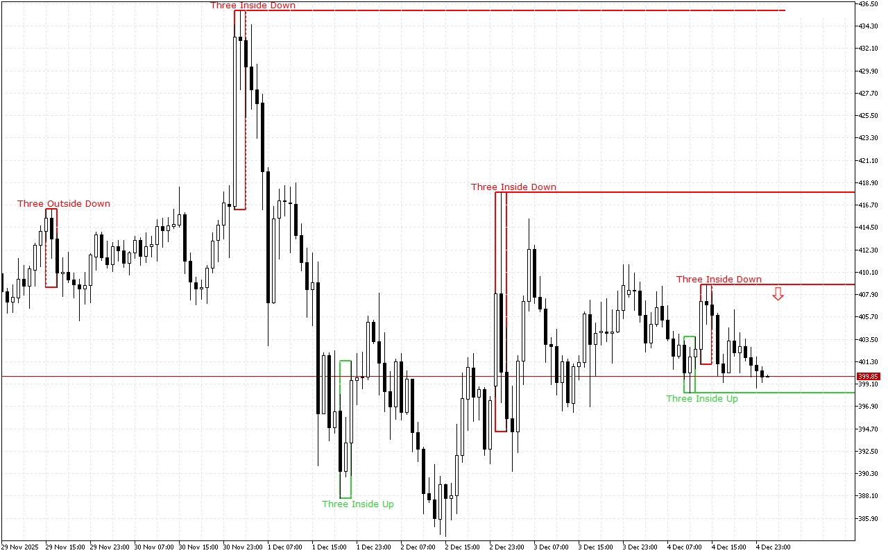 Ce niveau a été formé par le schéma Trois à l’intérieur du bas. Il s’agit de trois bougies japonaises : la 1ère bougie a un corps réel noir et court, la 2ème bougie a également un corps réel noir et est complètement à l’intérieur du corps de la 1ère bougie, et la 3ème bougie est également noire et clôture en dessous du corps de la 2ème bougie.