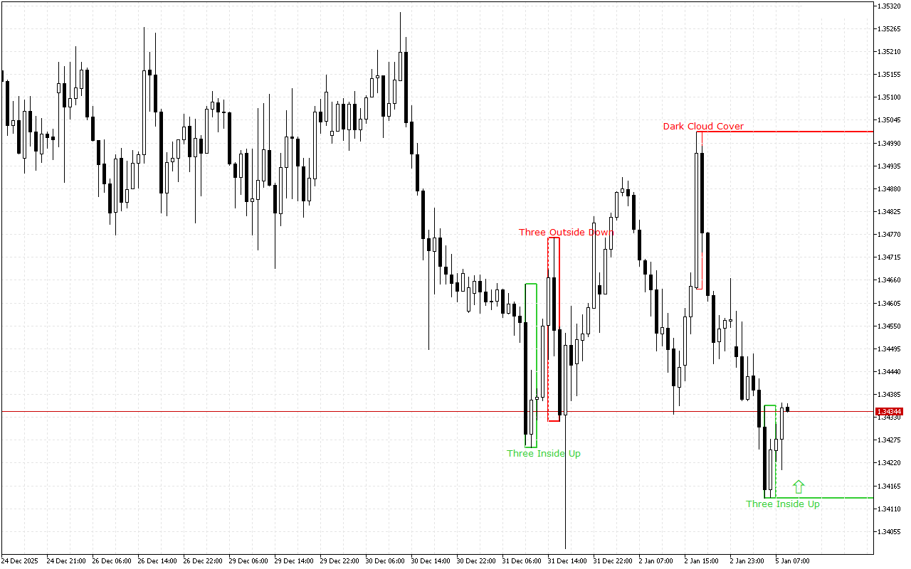 Ce niveau a été formé par le schéma Trois à l’intérieur en haut. Il s’agit de trois bougies japonaises : la 1ère bougie a un corps réel blanc court, la 2ème bougie a un corps réel blanc et se trouve complètement à l’intérieur du corps de la 1ère bougie, et la 3ème bougie est également blanche et se termine au-dessus du corps de la 2ème bougie.