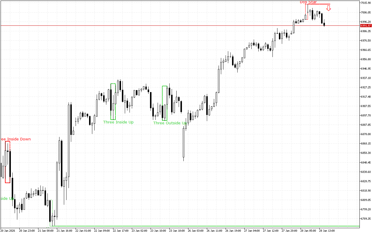 Ce niveau est formé par lle schéma de l’étoile baissière Doji. Ce schéma a un taux de confirmation assez élevé. Il se compose de deux bougies japonaises, dont la seconde est un doji, qui s’ouvre avec un gap vers le bas.