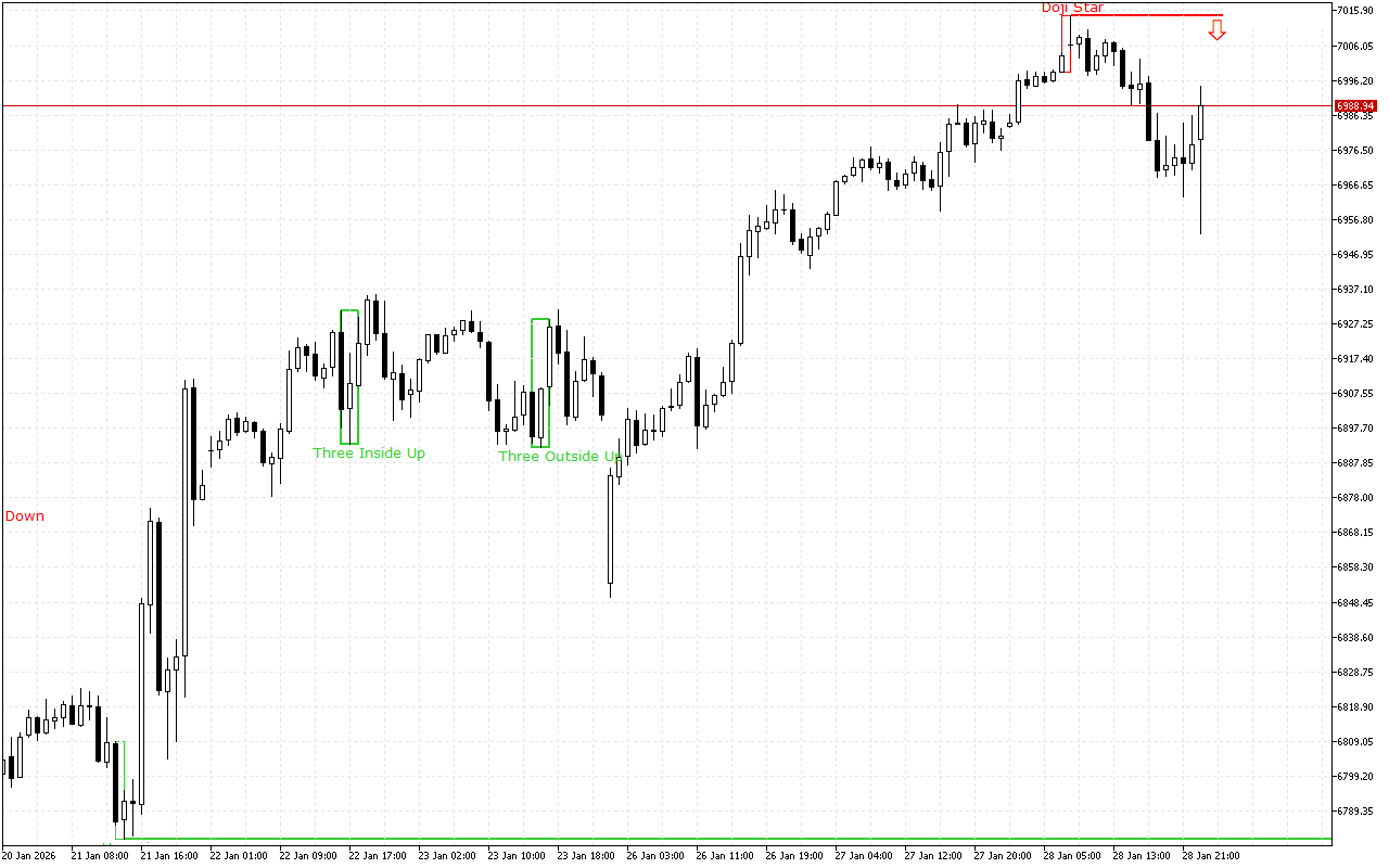 Ce niveau est formé par lle schéma de l’étoile baissière Doji. Ce schéma a un taux de confirmation assez élevé. Il se compose de deux bougies japonaises, dont la seconde est un doji, qui s’ouvre avec un gap vers le bas.