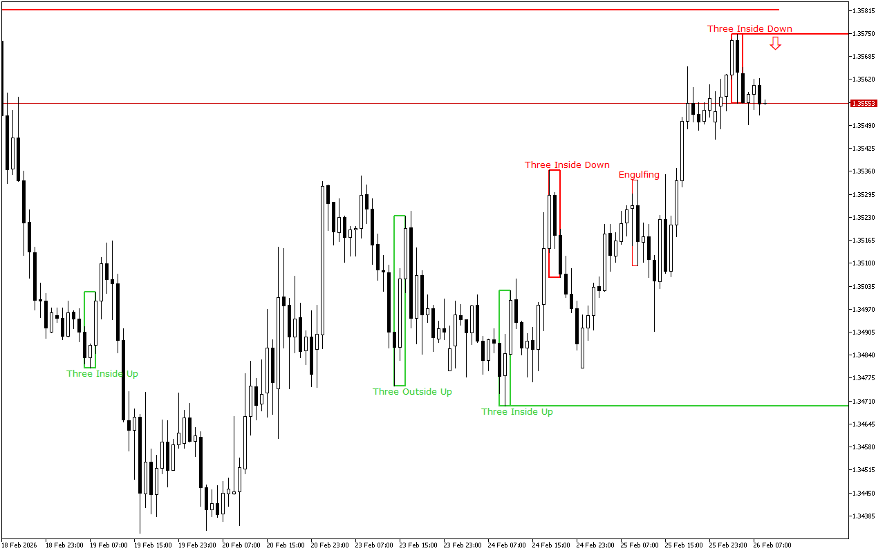 Ce niveau a été formé par le schéma Trois à l’intérieur en haut. Il s’agit de trois bougies japonaises : la 1ère bougie a un corps réel blanc court, la 2ème bougie a un corps réel blanc et se trouve complètement à l’intérieur du corps de la 1ère bougie, et la 3ème bougie est également blanche et se termine au-dessus du corps de la 2ème bougie.