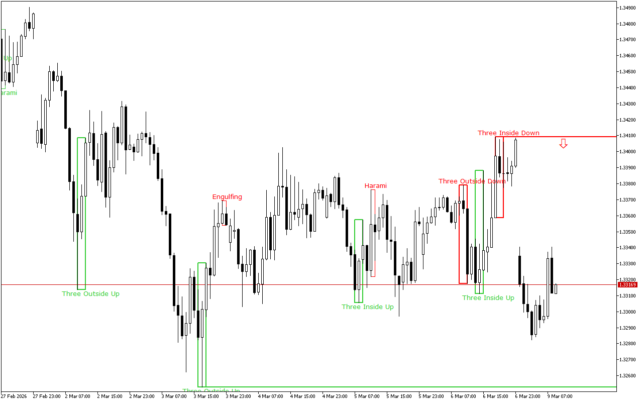 Ce niveau a été formé par le schéma des trois barres extérieures vers le haut. Il s’agit de trois chandeliers japonais : la 1ère bougie a un corps réel court et noir, la 2ème bougie a un corps réel long et blanc et englobe complètement la 1ère bougie, et la 3ème bougie est également blanche, clôturant au-dessus de la 2ème bougie.