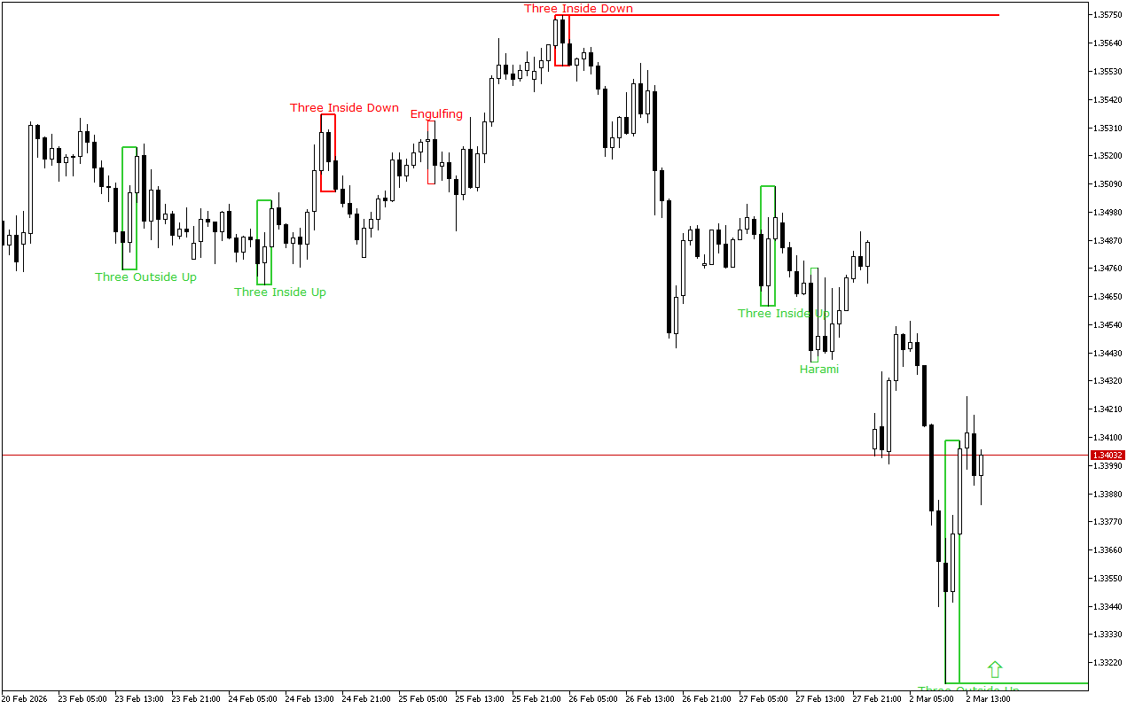 Ce niveau a été formé par le schéma des trois barres extérieures vers le haut. Il s’agit de trois chandeliers japonais : la 1ère bougie a un corps réel court et noir, la 2ème bougie a un corps réel long et blanc et englobe complètement la 1ère bougie, et la 3ème bougie est également blanche, clôturant au-dessus de la 2ème bougie.