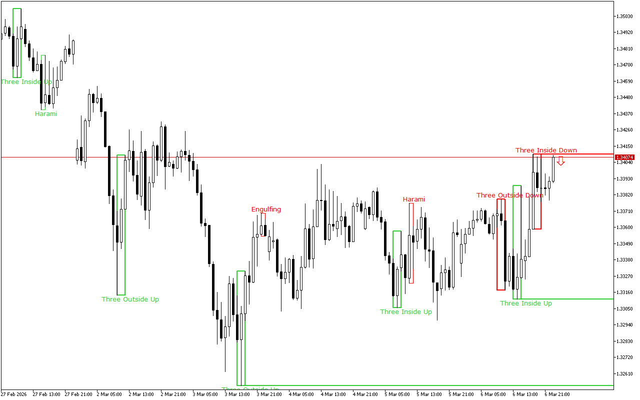 Ce niveau a été formé par le schéma Trois à l’intérieur en haut. Il s’agit de trois bougies japonaises : la 1ère bougie a un corps réel blanc court, la 2ème bougie a un corps réel blanc et se trouve complètement à l’intérieur du corps de la 1ère bougie, et la 3ème bougie est également blanche et se termine au-dessus du corps de la 2ème bougie.