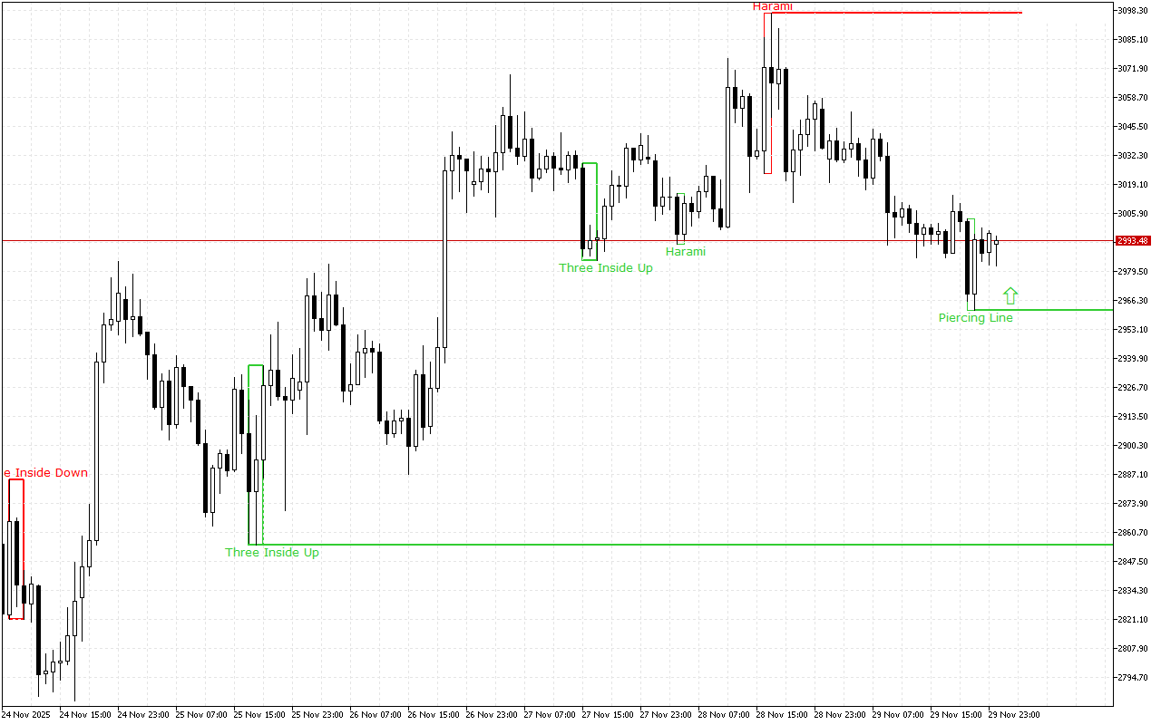 Паттерн «Проникающая линия» сформировал данный уровень. Паттерн состоит из двух японских свечей: первая свеча длинная и черная, а вторая — белая, которая открывается с разрывом вниз и закрывается выше середины тела первой свечи.