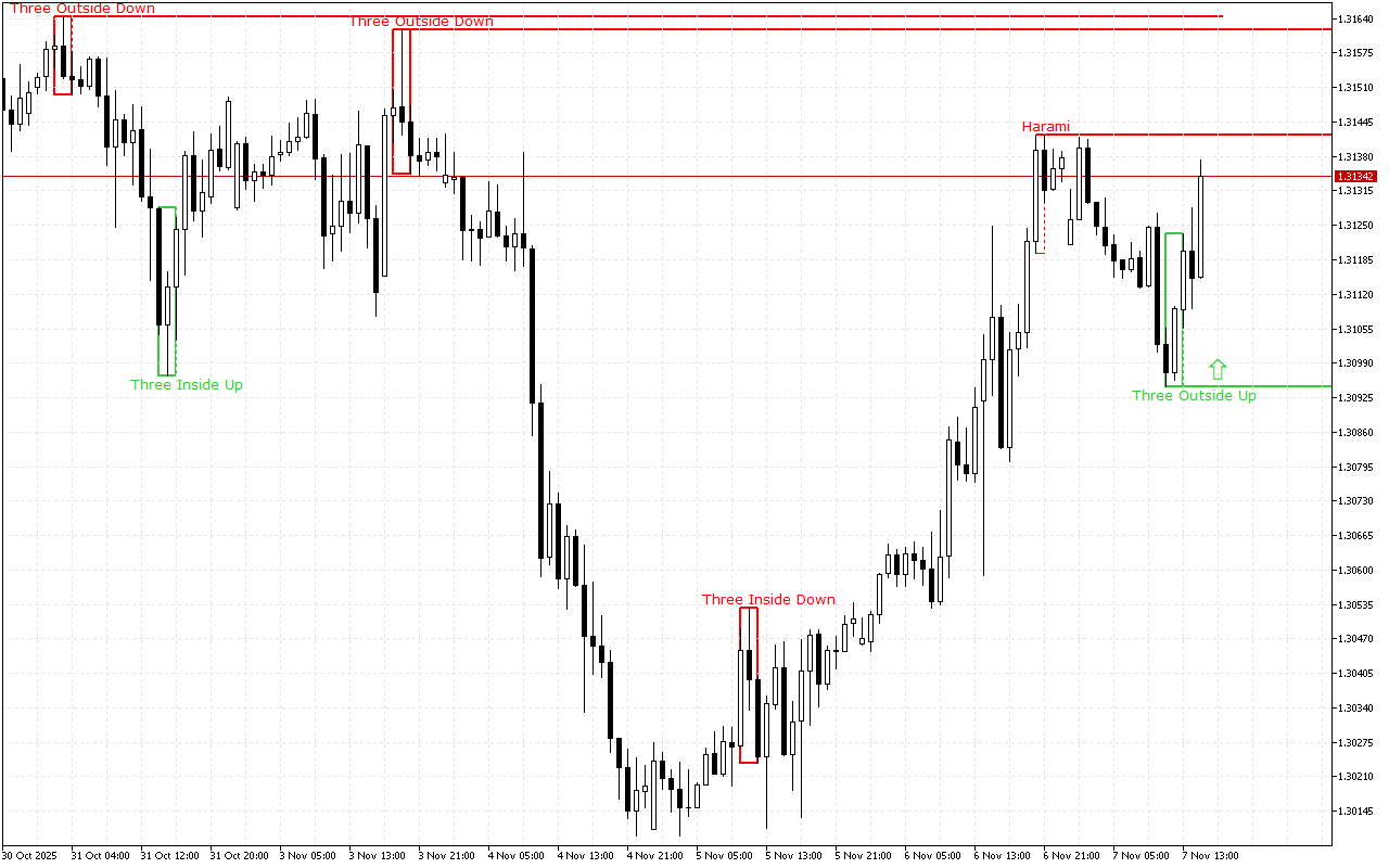 ระดับนี้เกิดจากรูปแบบ Three Outside Bars Up รูปแบบนี้ประกอบด้วยแท่งเทียนญี่ปุ่น 3 แท่ง แท่งเทียนแรกมีแท่งเทียนจริงสีดำสั้น แท่งเทียนที่สองมีแท่งเทียนจริงสีขาวยาวและกลืนแท่งเทียนแรกจนหมด และแท่งเทียนที่สามก็เป็นสีขาวเช่นกัน โดยปิดเหนือแท่งเทียนที่สอง